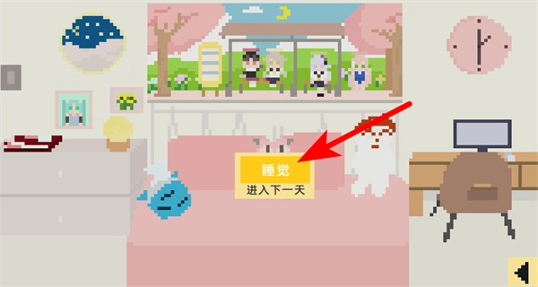 4、结束当天的所有行动后,要点击睡觉按钮,这是推进游戏天数的关键操作,点击后就会进入下一天的养成环节。