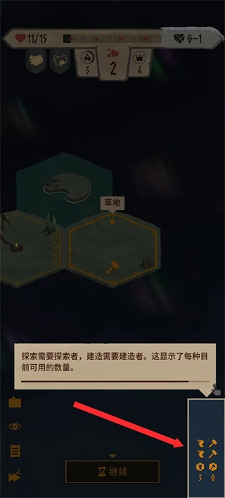 1、在地图界面里,点击红色箭头所指的继续按钮,这是关闭引导提示、推进地图探索进程并解锁新区域的关键操作。