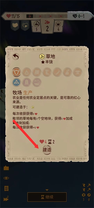 2、进入草地地块的建筑界面后,点击红色箭头所指的建造按钮,消耗相应资源建造牧场,以获得稳定的资源产出。
