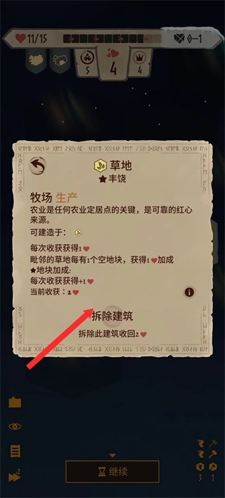 4、要是遇到资源不够的情况,可以在牧场建筑界面里找到那个红色箭头所指的拆除建筑按钮并点击它,这样就能回收一部分红心资源,以便灵活地调整资源配置。