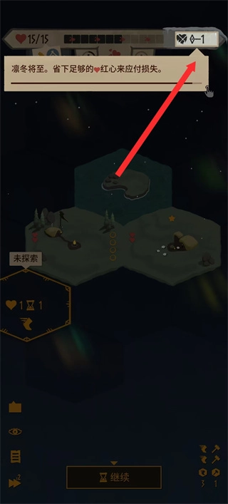 3、当看到“凛冬将至”的提示时,请注意红色箭头所指的红心资源栏,提前储备足量红心,以便应对后续可能出现的资源消耗情况。