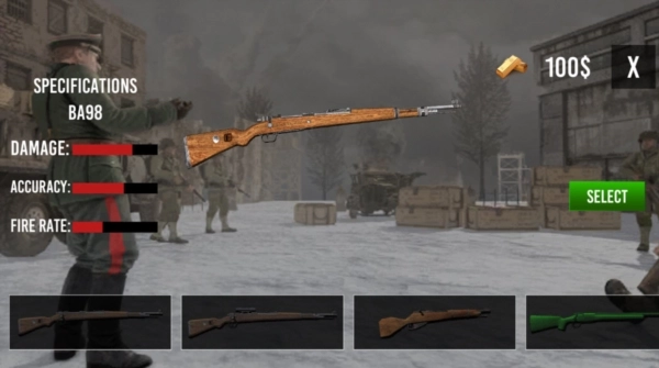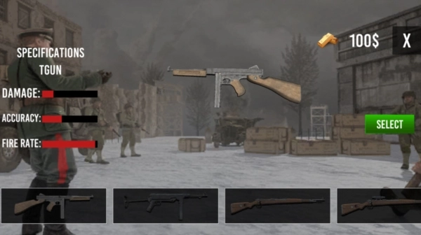 拥有二战时期的各类武器,像MP40冲锋枪、雪橇、汤普森冲锋枪以及形形色色的狙击枪射击装备
