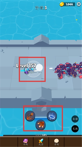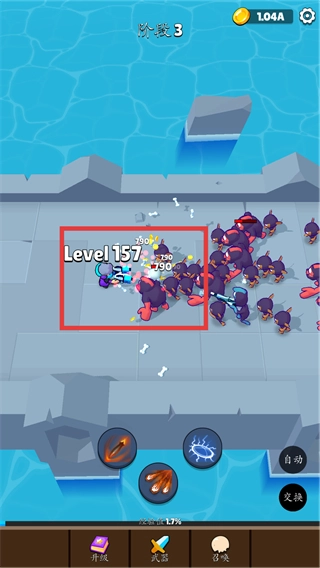 1、在【Level-157】关卡里,操控角色靠近敌方群体就能触发战斗,利用关卡场景的地形把敌人聚拢起来,这样后续输出会更方便。