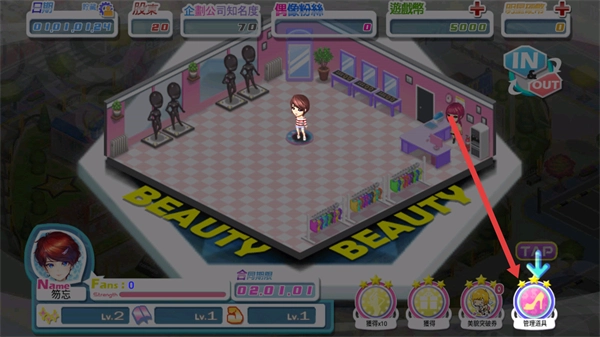 2、进入美容店界面后,点击“管理道具”选项,即可打开道具与装扮的选择界面。