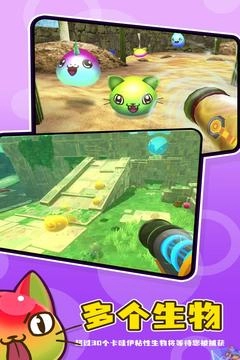 2、探索每一个遍布着各种粘液的世界,这里有彩虹、独角兽、猫咪等多种元素可以与你互动。