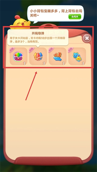 1、背包内有【开局导弹】【+3】等道具,开局导弹每10步出现一个,最多三个,可助力关卡开局,提升闯关效率。