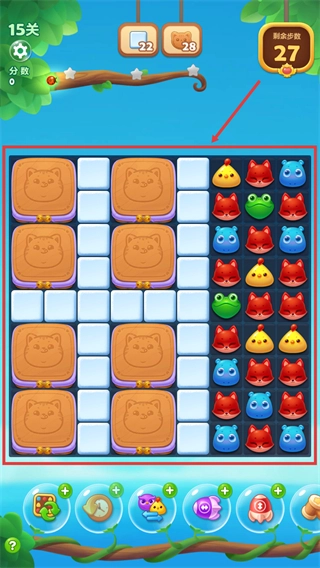 3、第15关剩余步数27,界面有多种动物头像,合理消除可推进关卡进度,争取达成目标。