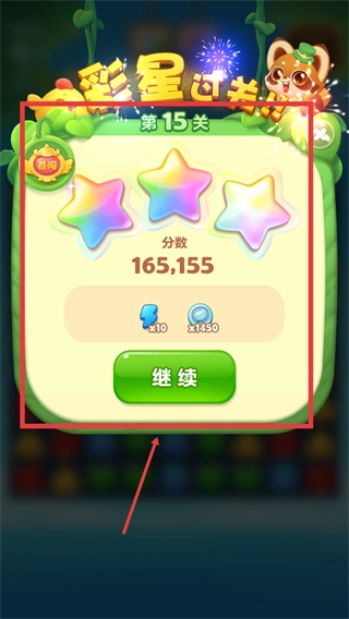 4、第15关获得三颗彩星,分数165155,点击继续可进入下一关,保持状态争取更好成绩。
