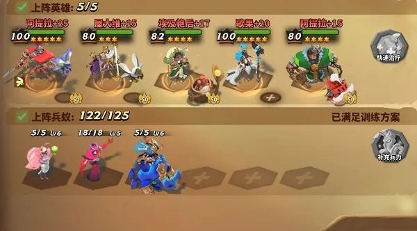 这里提供两种兵种搭配方案:若你拥有2个前排坦克英雄,可采用6只治疗蚁搭配剩余全部火焰蚁的组合;要是前排坦克英雄的坦度不足,则调整为5只治疗蚁、5只厚甲猛蚁,剩下的位置仍用火焰蚁填充。
