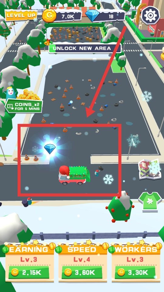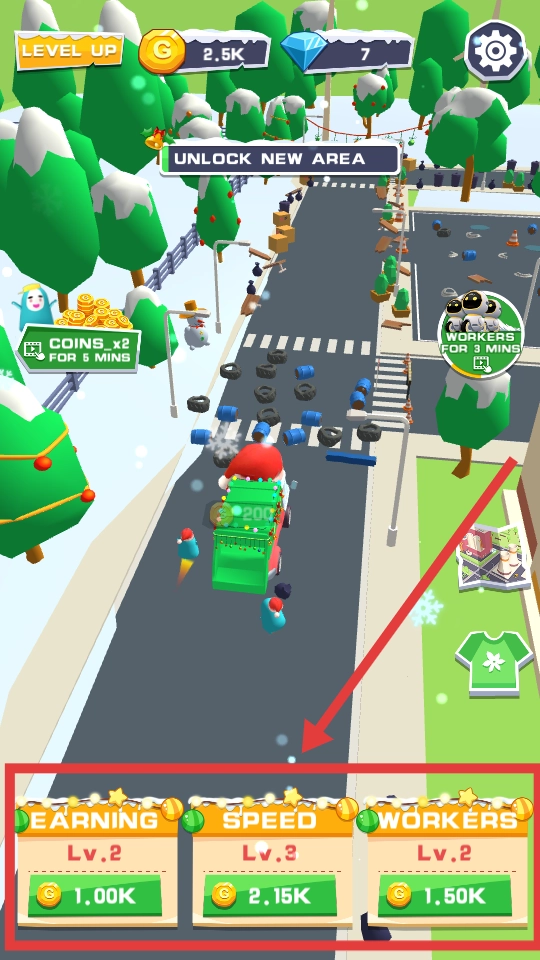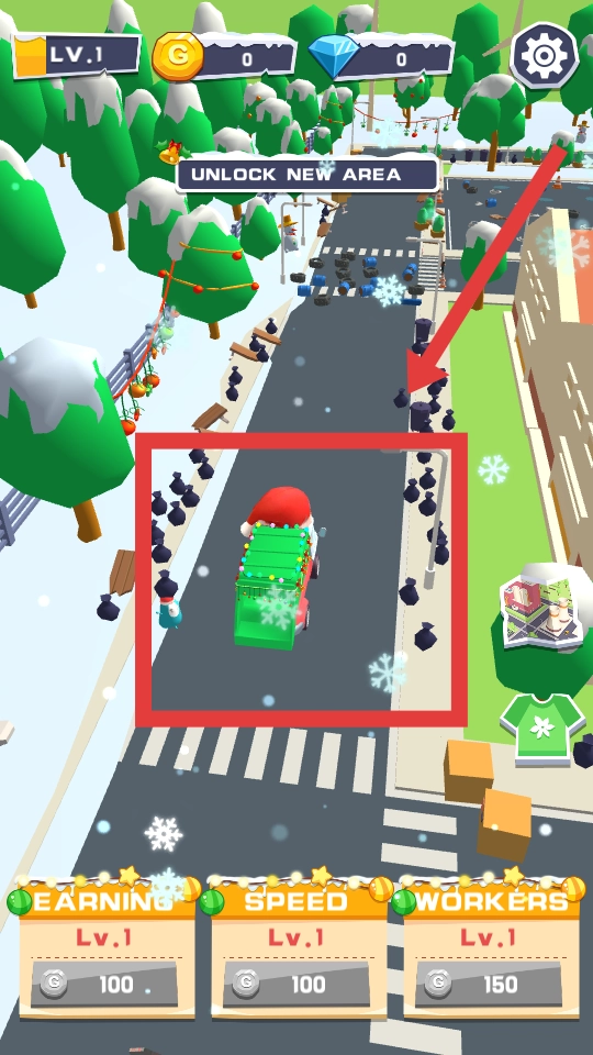 进入游戏的第一关,你需要操控一辆装饰着圣诞元素的卡车在街道上行驶,清理掉道路上堆积的黑色垃圾,以此推进解锁新区域的进程。