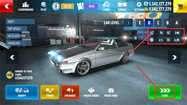 1、在车辆界面确认【CAR-LEVEL】等属性数值后,点击【START】按钮,即可进入对应的漂移赛事关卡开启挑战。