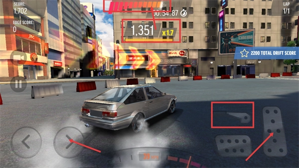 2、比赛中通过控制按钮操控车辆漂移,关注【1,351-x1.7】的分数加成,朝着【2200-Total-drift-score】目标积累分数。