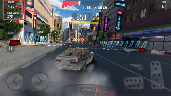 3、持续保持漂移状态提升【SCORE-4,931】与【EDGE-SCORE-430】,配合【51-MPH】车速维持赛事节奏。