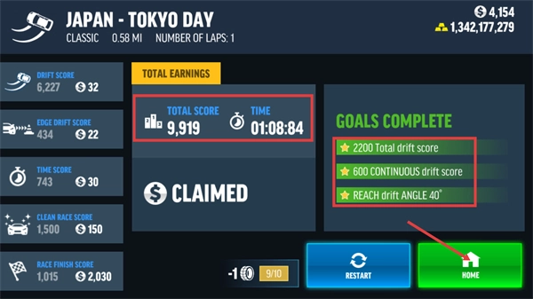 4、赛事结束后查看【TOTAL-SCORE-9,919】,确认【GOALS-COMPLETE】的目标,点击【HOME】返回主界面。