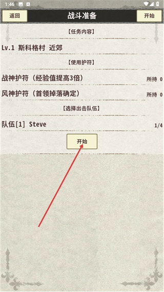 3、进入战斗准备界面,确认出击队伍是队伍1Steve后,点击界面上的开始按钮启动战斗。