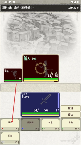 4、进入斯科格村近郊的第一场战斗界面后,点击攻击按钮,向等级1的猎人发起战斗攻击。