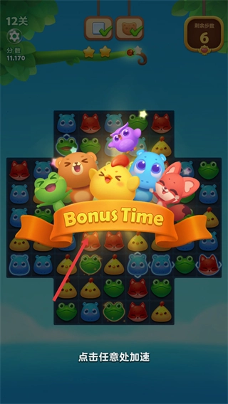 4、达成目标后会触发【BonusTime】奖励环节,点击任意位置能够加快动画播放速度,从而快速获得额外分数和关卡奖励。