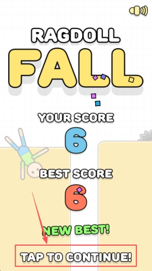 4、查看成绩:落地后显示“YOUR SCORE 6”与“NEW BEST!”,点击“TAP TO CONTINUE!”返回主界面。