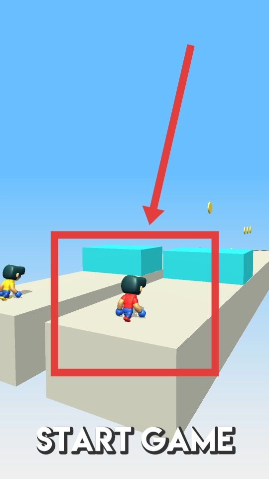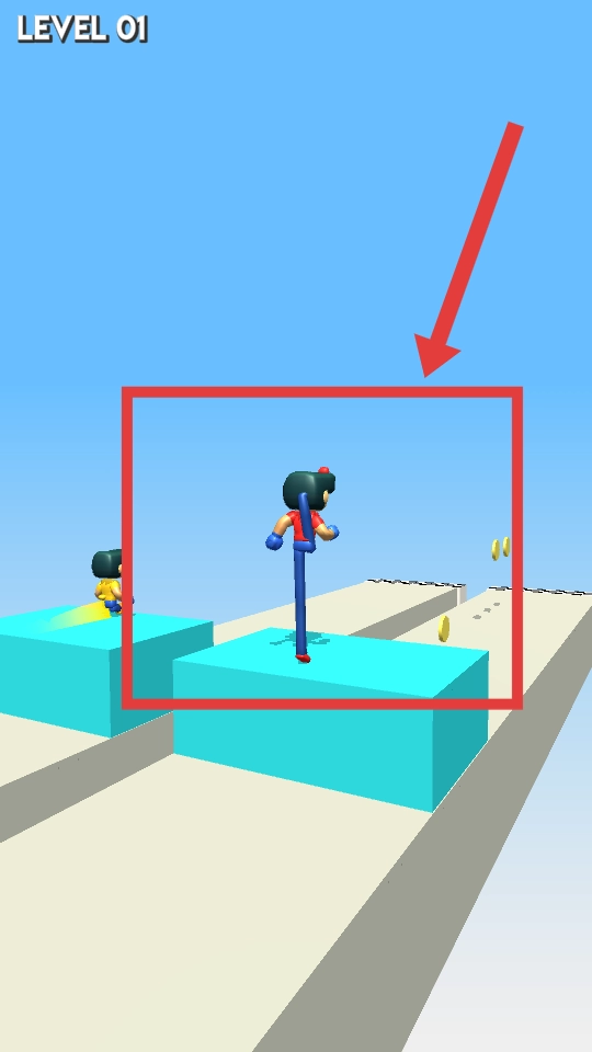 在第一关的跑道上,角色会碰到蓝色方块,得通过滑动或点击操作让角色跳跃、越过障碍,并且收集沿途的金币。