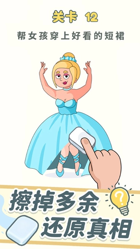 新颖、简单又有趣的游戏机制:把手指放在屏幕上擦一擦,删掉多余部分,找出角色藏在哪里,还能修改故事情节。