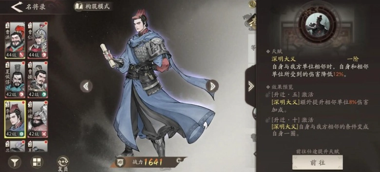 李典在培养之前一定要明确他的不可替代性主要是在核心效果上面,因为他在游戏当中不是总的输出定位武将,而是防御型的武将,大家也可以把李典看作是一个辅助类型武将,他的核心效果就放在为队伍承伤或者是降低针对伤害的能力上面,只要将他这两方面的能力用好,这个角色就是非常强势的,所以用他来搭配阵容的话,大家一定要注意一些慢节奏的阵容会比较适合他,然后靠他的续航以及反击,他的输出也是可以搭配的。