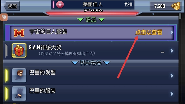 2、在装扮列表中,点击赠品中的宇宙的巨人服装。