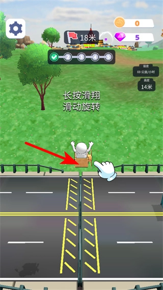 1、当角色处于滑翔阶段时,长按红色箭头所指的角色区域即可触发滑翔操作,通过滑动还能控制角色旋转,从而助力角色实现更远距离的推进。