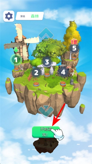 1、进入森林关卡选择界面后,点击红色箭头指向的开始游戏按钮,进入关卡流程,开启游戏挑战的关键操作。
