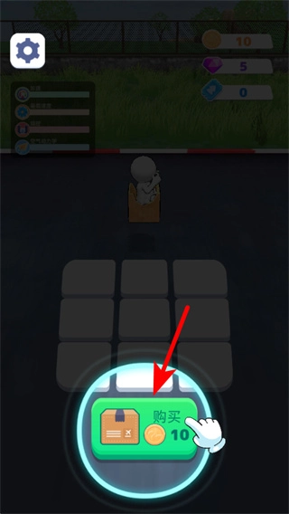 2、在关卡准备界面中,点击红色箭头指向的购买按钮,消耗10金币获取道具,为后续车辆组装储备部件。