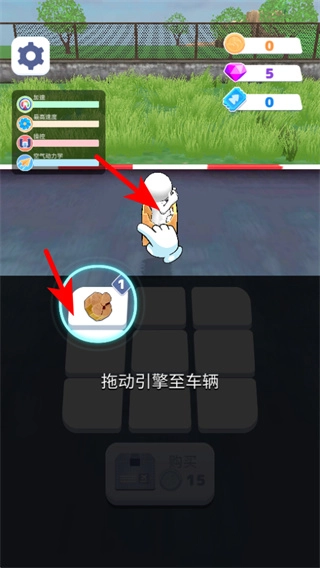 3、按照指引,拖动红色箭头指向的引擎道具至车辆位置,完成车辆部件的组装,为角色的发射挑战做准备。