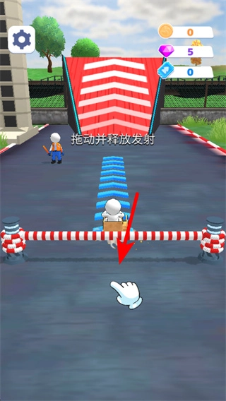 4、拖动红色箭头指向的角色并释放发射,让角色通过弹射装置推进,完成关卡的挑战流程。