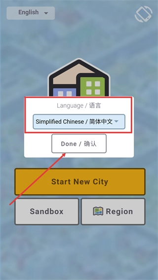 1、选择【Simplified-Chinese-简体中文】后点击【Done-确认】按钮,再进入【Start-New-City】创建属于你的新城市,开启建设之旅。