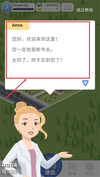 2、与城市顾问【Anna】互动,阅读她的欢迎提示,跟随引导了解基础操作,为后续城市建设做好准备。