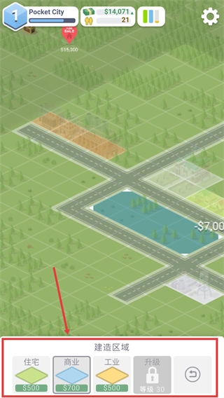 3、在【建造区域】界面选择【住宅】-【商业】-【工业】类型,按预算规划布局,逐步扩展城市规模。