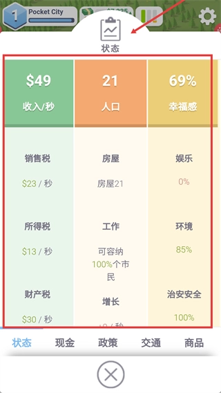 4、点击【状态】界面查看【收入/秒】-【人口】-【幸福感】数据,调整策略提升城市整体运营效率。