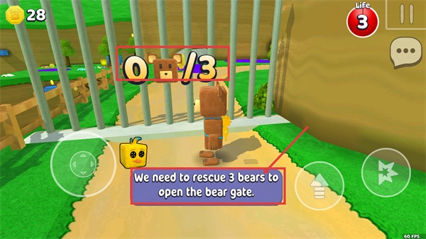 1、当前救援进度为【0/3】,需按提示【We-need-to-rescue-3-bears-to-open-the-bear-gate】完成3只熊的救援,才能开启熊门。