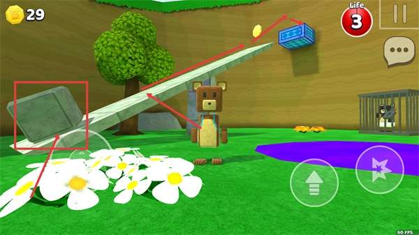 2、场景中出现【蓝色箱子】与笼中待救的小熊,先靠近【石块】进行互动,后续可借助其推进救援流程。