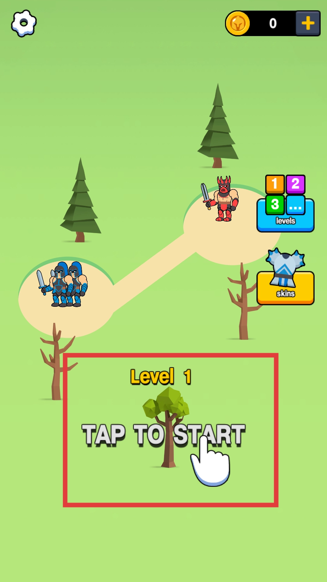 打开战争自走棋后进入游戏主界面,该界面以绿色草地为背景,还分布着几棵树木,同时显示着Level1和相关提示;点击“TAP TO START”区域,即可进入游戏关卡界面。