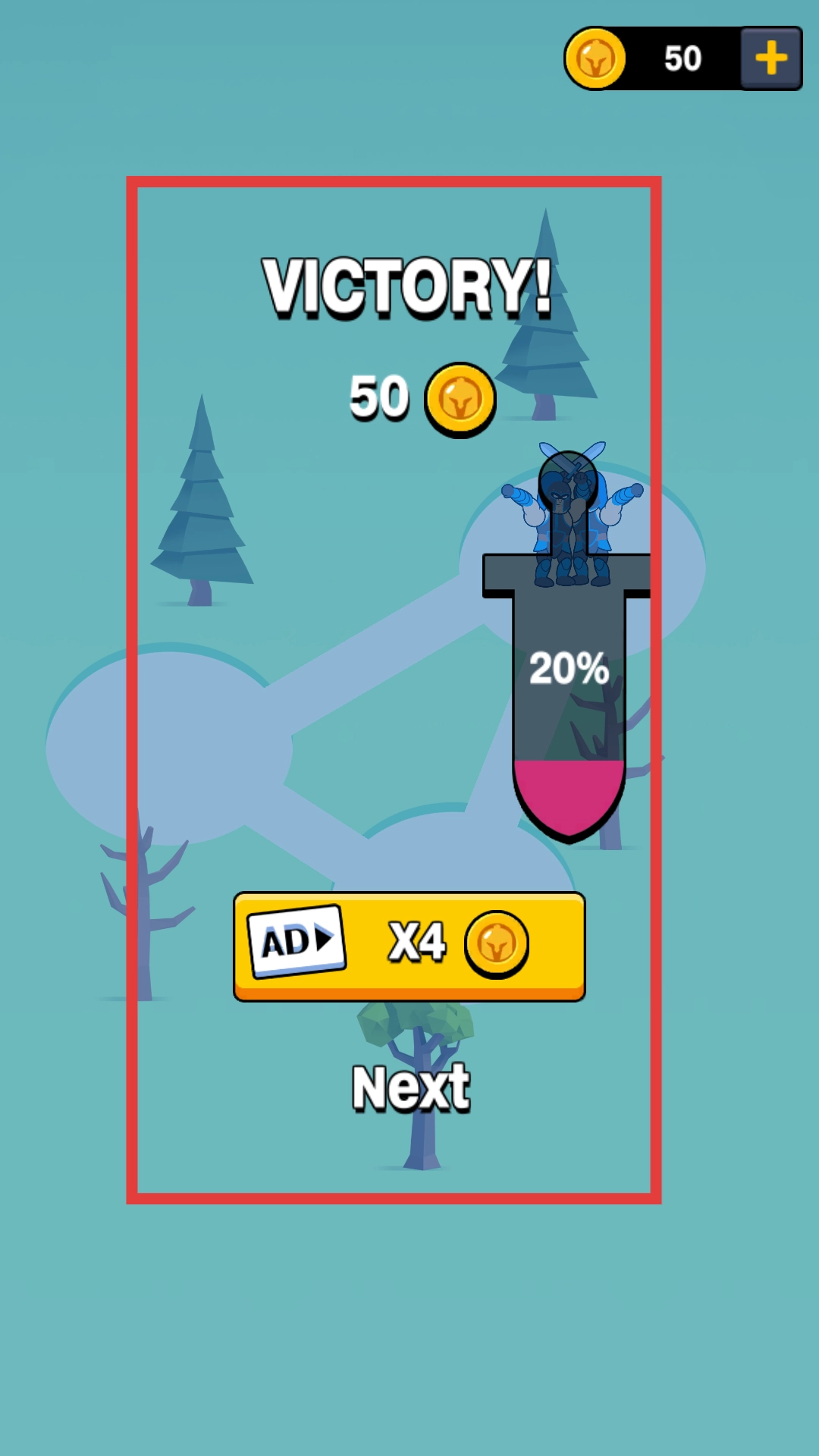 蓝色战士战胜红色恶魔后,游戏界面跳转至胜利界面,该界面呈现VICTORY字样,同时提示玩家获得了金币,还设有Next按钮,点击此按钮即可进入下一个游戏关卡。