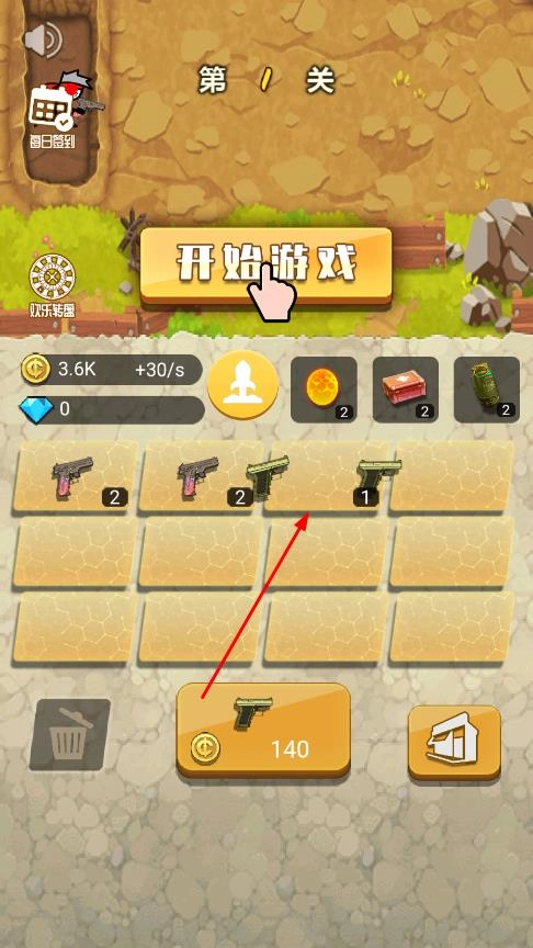 进入界面后,中间有个开始游戏的按钮,点击它就能进入战斗准备阶段。在这个阶段里,你可以购买武器并把它们放在格子中,还能通过合并相同等级的武器来提升武器的等级。
