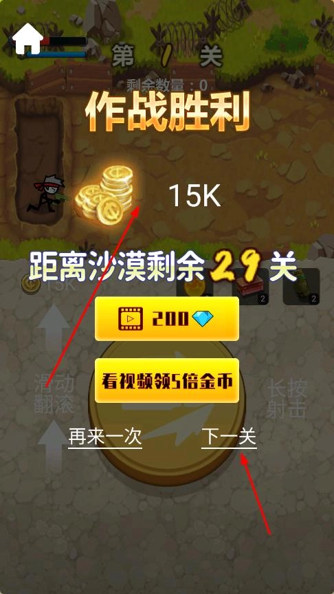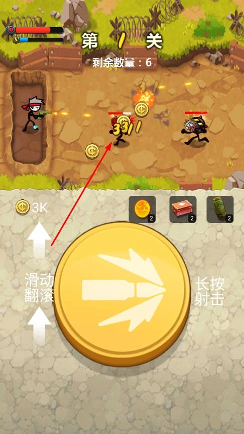 操控火柴人角色参与战斗,界面下方会显示操作按钮的提示。长按对应按钮可以进行射击,滑动屏幕则能让角色翻滚以躲避敌人的攻击。敌人会在战斗场景中出现,你需要通过射击来击败他们,成功击败敌人后就能获取金币奖励。