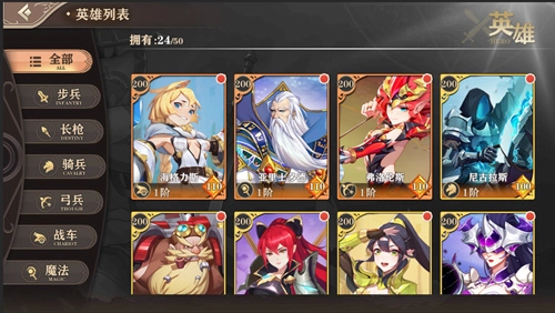每个英雄都对应着特定的兵种,总计有6种,分别是步兵、长枪兵、骑兵、弓兵、战车以及魔法师。在这些兵种里,步兵、长枪兵和骑兵属于前排兵种,弓兵与魔法师归为后排兵种。战车的情况比较特殊,其中攻城车只能部署在前排,弩车和投石车则处于后排位置。