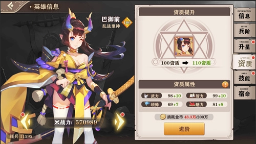 英雄资质的差异会直接作用于品质颜色与四维属性,这四维属性分别是武力、智力、统帅和魅力。其中,武力和智力会直接影响英雄的攻击能力以及技能伤害效果;统帅属性则与英雄所能统领的最大兵力相关;魅力属性的高低则会对英雄的防御力产生影响。四维属性实际上是对英雄自身属性的一种放大,当英雄等级提升、兵阶提高后,资质所带来的成长效果会愈发显著。