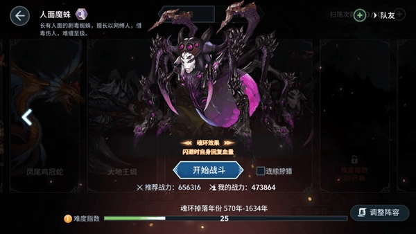 合理的阵容搭配。当魂兽实力远超魂师时,就得考虑靠阵容提升猎杀成功率。拿这只人面魔蛛来说,推荐战力是65万,可我的战力才47万。这18万的战力差距该怎么弥补呢?