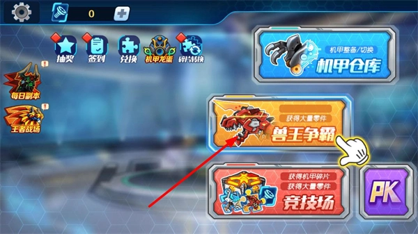 2、点击兽王争霸等玩法的入口,参与对应的玩法就能获取大量零件等资源,这些资源可以用来养成机甲和升级装备,从而支撑机甲提升属性。
