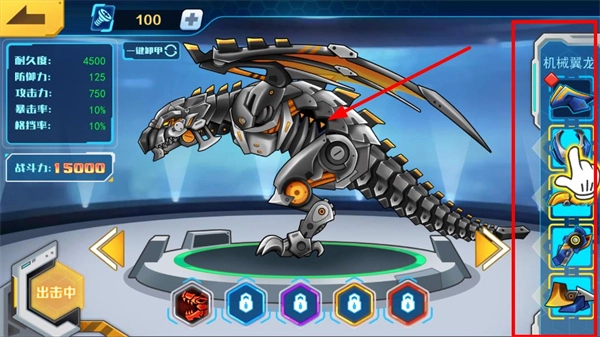 进入主界面后,点击机甲仓库,接着在右侧的装备栏里挑选对应的部件,为机甲进行装备搭配,以此提升它的耐久度、防御力等属性。