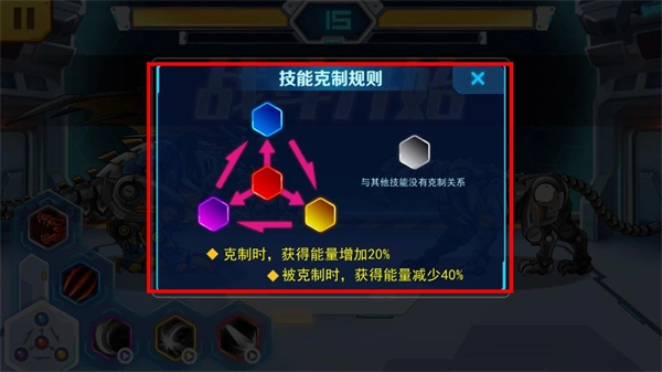3、熟悉技能克制的相关规则,不同颜色的技能之间存在克制与被克制的关系。当使用克制对方的技能时,获取的能量会提升20%;若技能被对方克制,则能量获取会降低40%。因此在战斗过程中,要借助这一克制规则来合理选择释放的技能。