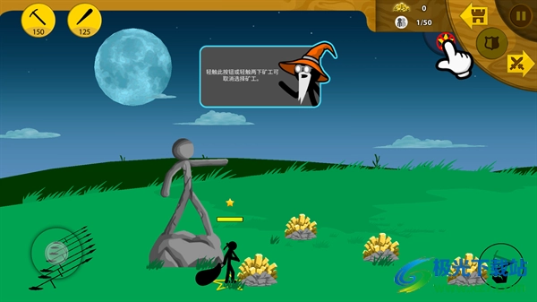 4、点击左上角的按钮可以训练矿工,轻触矿工可控制他,点击右上角的星星可以取消选择;