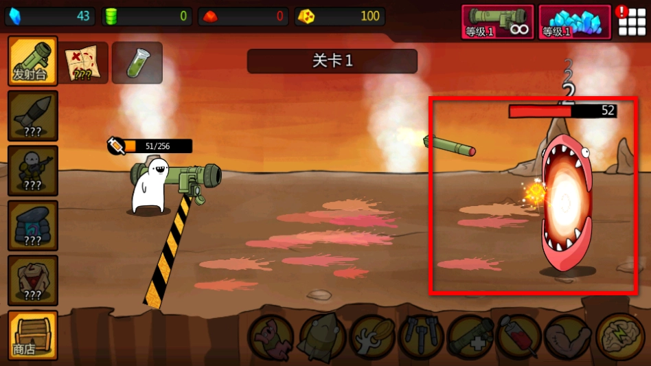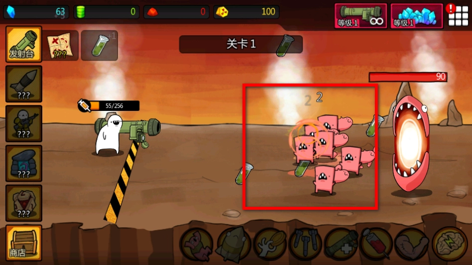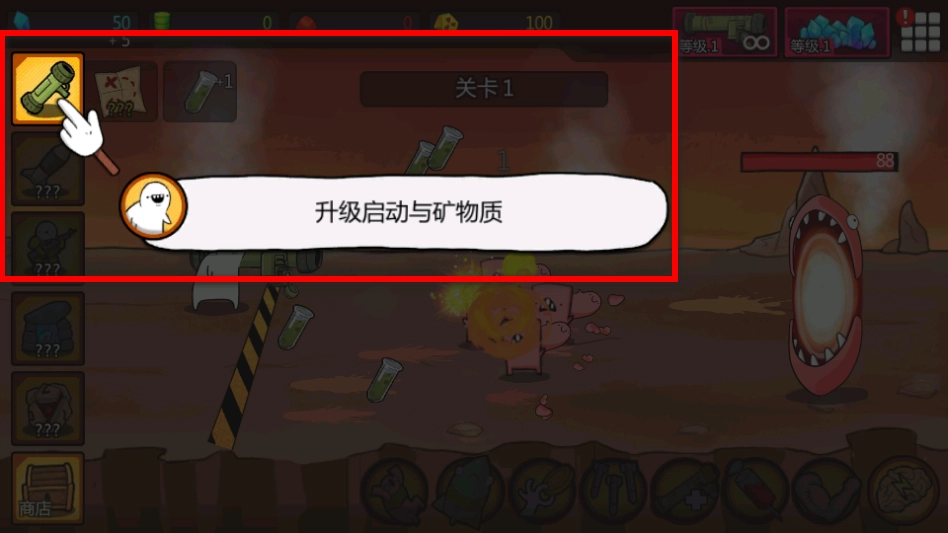 进入第一关后,点击左边的发射台就能发射炮弹攻击怪物,另外还能借助矿物质来升级发射台,这样炮弹的威力会变得更大,击退怪物也会更轻松。