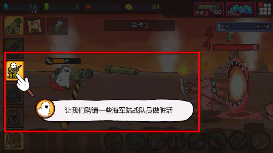 还可以招募海军陆战队员协助战斗,他们会运用武器对怪物发起攻击,再配合发射台的炮弹,能够更高效地歼灭怪物,推动关卡进度。